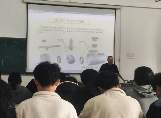 本次课程充分体现了“讲练结合、学以致用”的教学理念。付老师并非单向灌输理论,而是在厘清基本概念后,随堂布置典型的投影作图练习。他巡视课堂,及时关注学生的作图过程,对普遍存在的疑惑点进行集中点拨,并选取具有代表性的学生作业进行现场评析。这种即时反馈的教学模式,有效帮助学生从“听懂”迈向“会用”,将抽象的投影规律内化为扎实的绘图技能。课堂节奏张弛有度,学生在思考与实践中稳步构建起扎实的空间思维能力。该系专业教师全程观摩,并在课后围绕教学内容与方法开展了深入交流,对这种富有成效的“讲练结合”模式给予了高度评价。